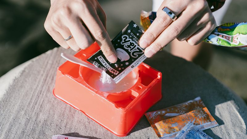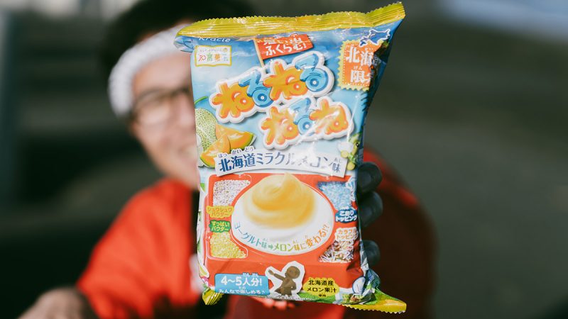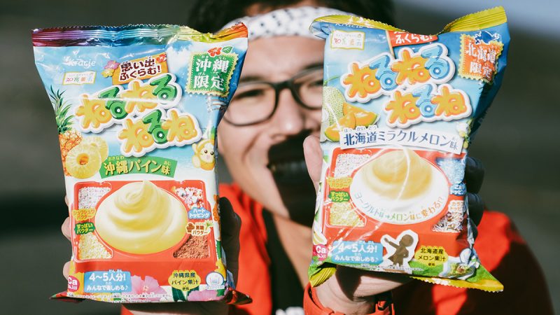 北海道限定ねるねるねるねが「北海道ミラクルメロン味」で、沖縄限定ねるねるねるねが「沖縄パイン味」になっている。ちなみに北海道ミラクルメロン味は、基本はヨーグルト味なのだけれど、「ミラクルメロンパウダー」を入れることでメロン味に変わる。ミラクルなのだ。